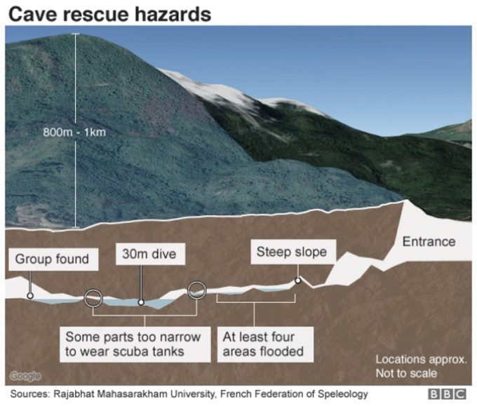 Attualmente il livello dell’acqua è più basso che negli scorsi giorni ma non è escluso che salga nuovamente nelle prossime ore se la pioggia dovesse ricominciare. L’iniziale ipotesi di lasciare il gruppo nella caverna per settimane (o addirittura mesi) nell’attesa che le piogge finiscano è stata giudicata troppo pericolosa per la vita dei ragazzi e del loro allenatore di calcio.