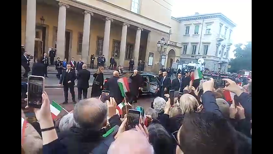 Giunto al Teatro Regio (Via Garibaldi blindatissima), in auto blu presidenziale, ha trovato ad accoglierlo una folla festante con bandierine tricolori, anche se non è mancata qualche voce di protesta che si è alzata dal coro.