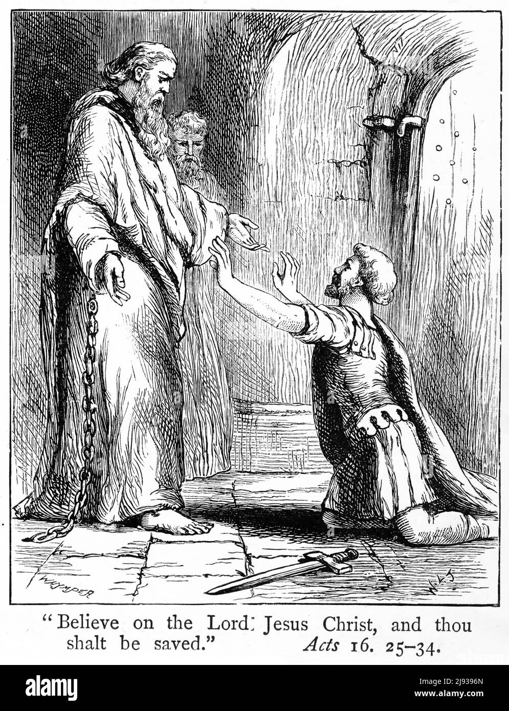 In questo brano, Paolo e Sila sono incarcerati a Filippi, dopo essere stati percossi e gettati in prigione a causa della loro predicazione. mezzanotte, Paolo e Sila pregano e cantano inni a Dio, nonostante le catene e le ferite. Un terremoto improvviso scuote la prigione: le porte si aprono e le catene si spezzano. Il carceriere, svegliandosi e vedendo le porte aperte, teme che i prigionieri siano fuggiti. In un gesto disperato, prende la spada per uccidersi: sapeva che, secondo le leggi romane, la fuga dei detenuti gli sarebbe costata la vita.