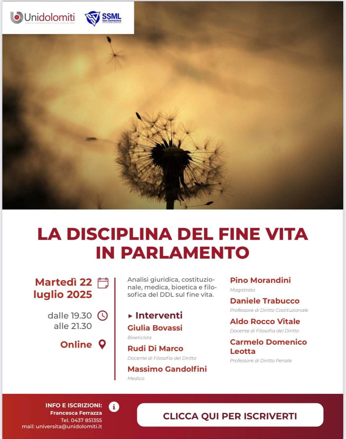 Martedì 22 luglio 2025, dalle ore 19.30 alle 21.30, si terrà online un incontro dal titolo: “La disciplina del fine vita in Parlamento”, promosso dall’Università Unidolomiti e dalla SSML San Domenico. Un tema delicato, che tocca la coscienza di un’intera civiltà e che merita di essere affrontato non solo sul piano normativo, ma anche su quello antropologico, medico e filosofico.