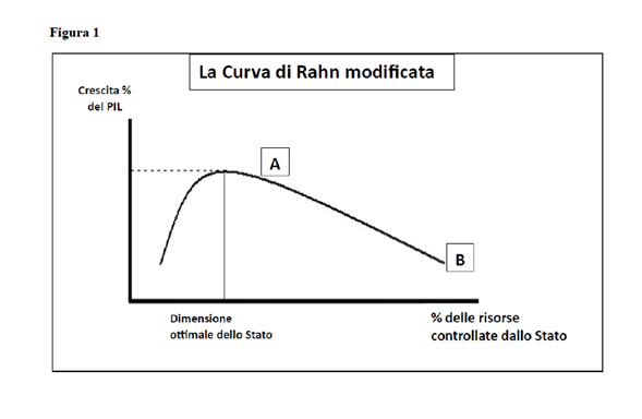 Come quadro teorico, utilizzeremo l’analisi condensata nella Curva di Rahn (esposta in una Nota anteriore), ma in una versione modificata. Nelle economie con un’elevata quota di imprese statali o un controllo quasi assoluto sull’economia (ad esempio, Venezuela, Cuba, Corea del Nord, ex Unione Sovietica, ecc.), misurare le dimensioni dello Stato esclusivamente in termini di spesa pubblica/PIL può essere fuorviante, poiché lo Stato controlla ampie porzioni di risorse senza doverle riflettere come spese di bilancio. In tali casi, una versione della “Curva di Rahn basata sul controllo statale delle risorse” è più appropriata per analizzare l’effetto delle dimensioni dello Stato sulla crescita ed il benessere economici. Pertanto, sulla base della versione alternativa della Curva di Rahn, riprodotta nella Figura 1, le transizioni estreme che analizzeremo in questa (ed alcune Note successive), possono essere interpretate come il passaggio da un punto come A a uno come B o viceversa.