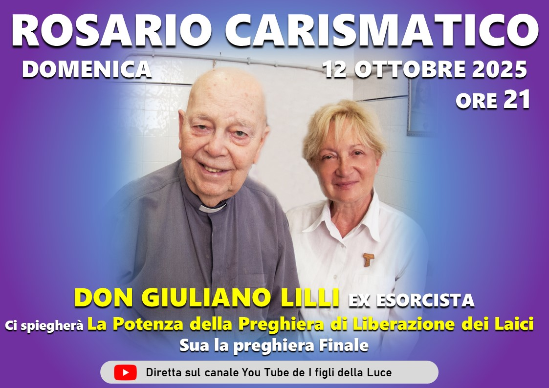 Un appuntamento di fede e di preghiera aperto a tutti i credenti: domenica 12 ottobre alle ore 21 si terrà il Rosario Carismatico guidato da Don Giuliano Lilli, ex esorcista, in diretta sul canale YouTube I Figli della Luce , di Suor Angela Musolesi.