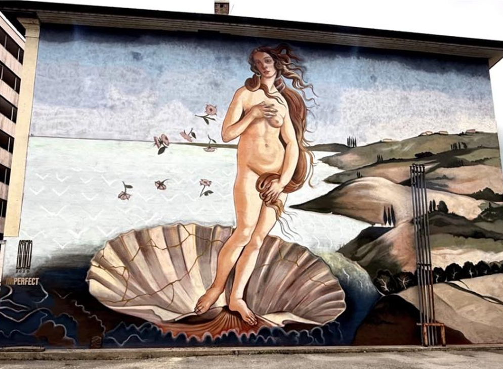 Chiasso ha la sua Venere. L’ha dipinta Andrea Ravo Mattoni, artista italo-svizzero noto per riportare i capolavori della grande pittura nello spazio pubblico: in Corso San Gottardo 109, per la terza edizione di Urban Art Chiasso, ha realizzato un murale ispirato alla Nascita di Venere di Botticelli. L’opera rilegge l’icona rinascimentale con una sensibilità contemporanea, alludendo al tema della ferita che diventa rinascita, in dialogo con l’idea del kintsugi (le crepe saldate d’oro: la fragilità come forza) e con le storie della città che scorrono sotto il muro.