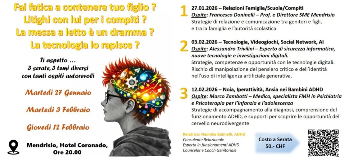 Le tre serate si svolgeranno all’Hotel Coronado di Mendrisio, col costo di 50 franchi a serata. Per Nadinka sono l’inizio di un progetto più ampio, una formazione giornaliera bimestrale rivolta a genitori, insegnanti per portare loro consapevolezza del funzionamento, tecniche e strategie concrete per la gestione dei ragazzi neurodivergenti, nello specifico con funzionamento ADHD, che Nadinka ha acquisito sul “campo” attraverso la crescita dei suoi 4 figli neurodivergenti come Lei.
